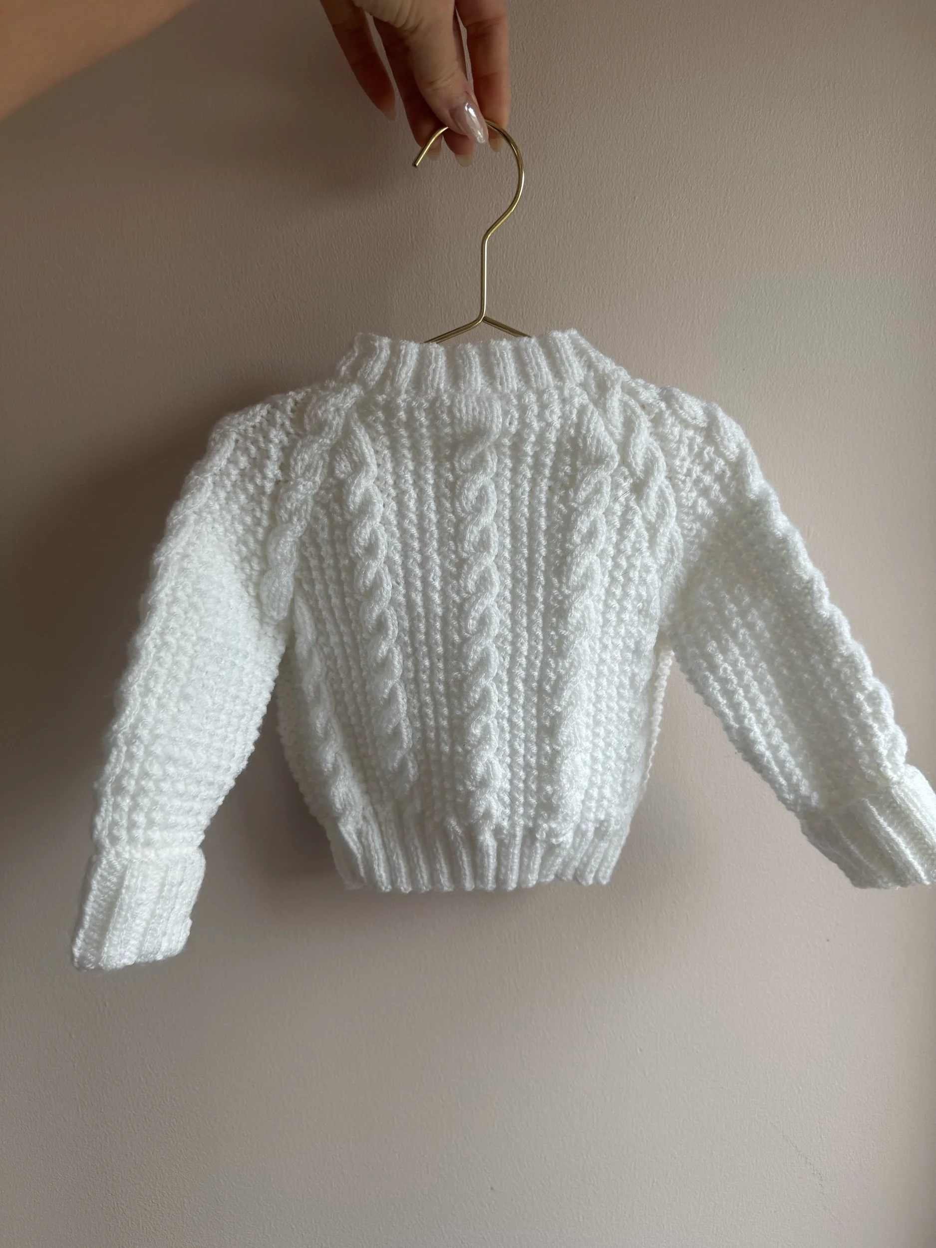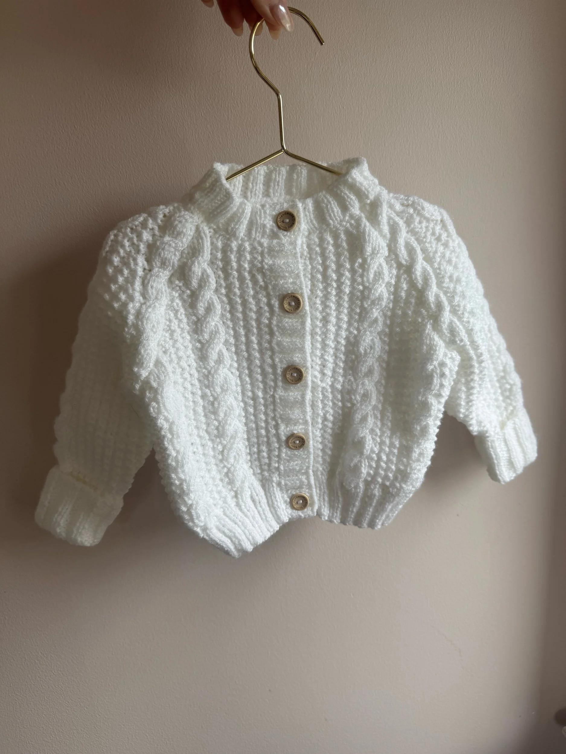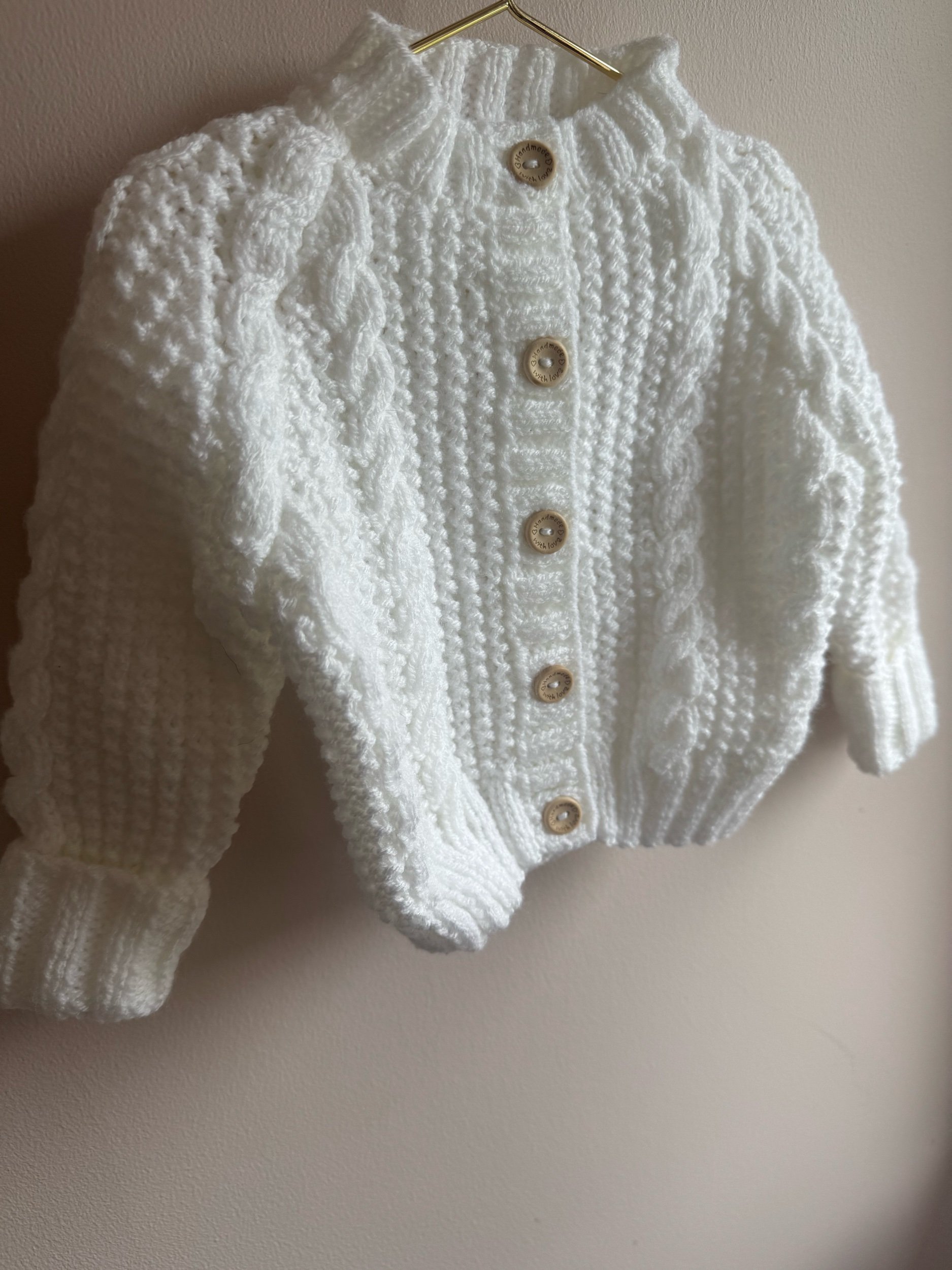 3-6 months white cable | Hand personalised baby cardigan